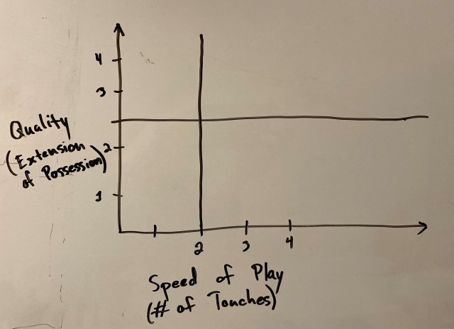 Art versus Science: Part of what makes limited touches a poor constraint is that it is being used to measure speed of play, ignoring the fact that you can take four or five touches very quickly or two touches very slowly. Furthermore, we are judging the quality of a player’s decision based on whether possession was lost within the next two passes (an attempt to give the player responsibility for not just the technical quality of the pass, but also the tactical quality of the pass). These units of measurement are chosen for their accessibility and clarity rather than for their perfect alignment with what we trying to judge. It is much easier to count to two in units of one, than to try to judge if a player took 1.9 or 2.1 seconds to release the ball.
